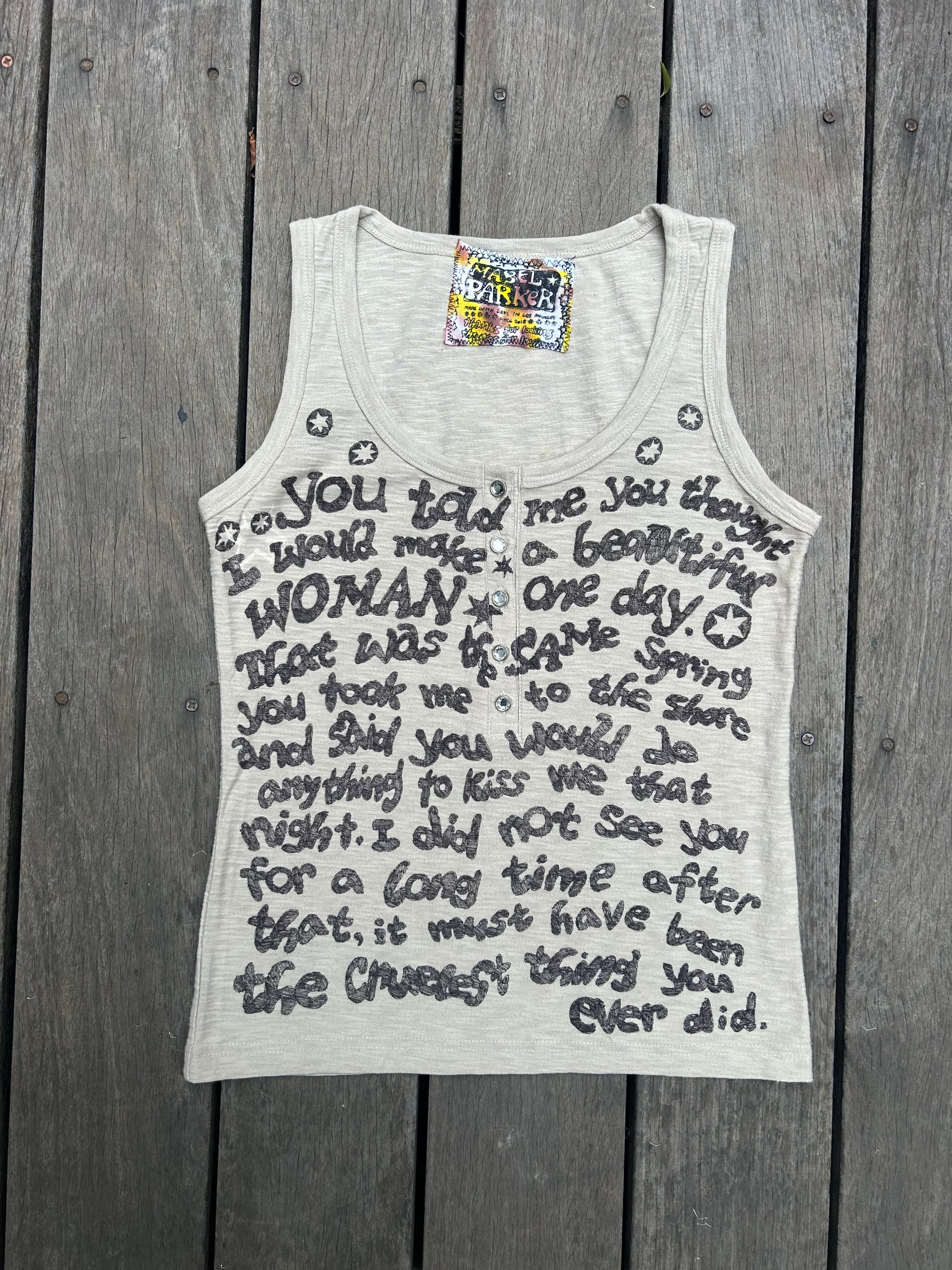 one of one - size small - hand drawn on vintage cotton tank with jeweled buttons